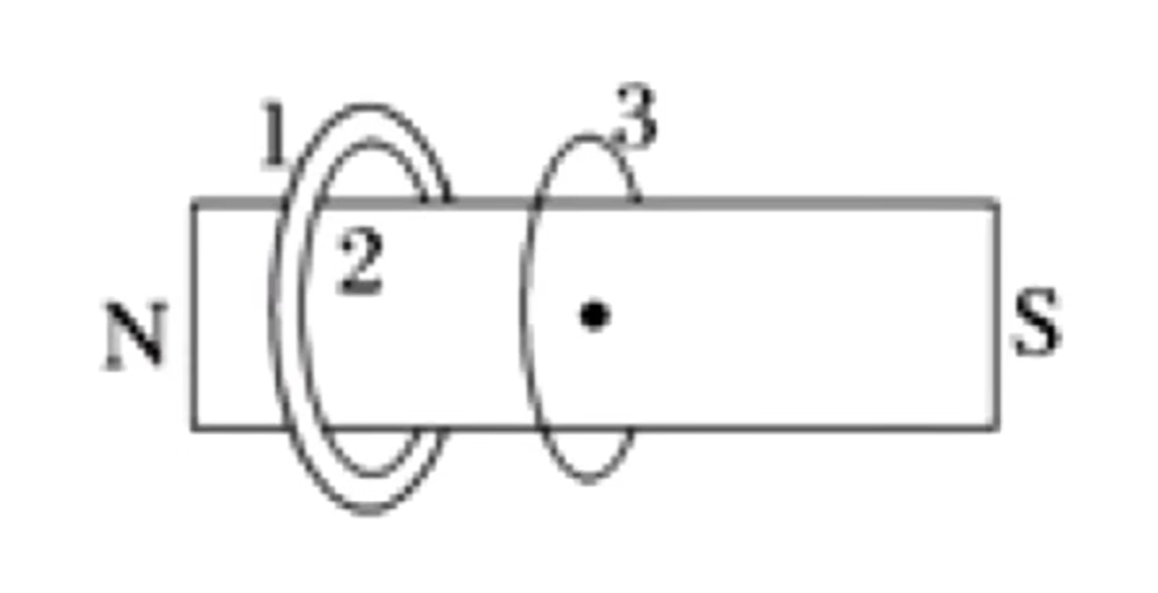 容易知道,每个圈内,磁铁内的磁通量是相同的,因此只需要考虑磁铁外、圈内的与磁铁内的抵消。容易发现,外面的磁通量 \(\Phi_1'>\Phi_2'>\Phi_3'\)。因此总的磁通量 \(\Phi_1<\Phi_2<\Phi_3\)。