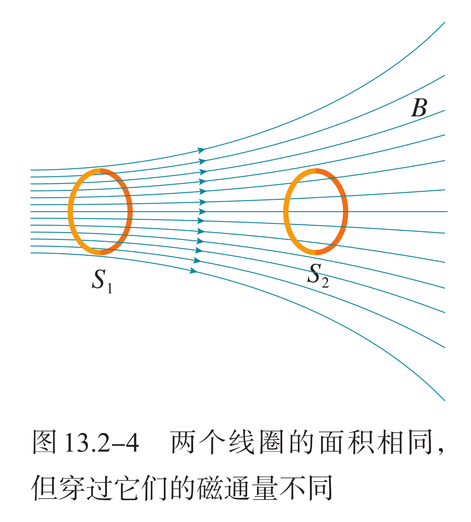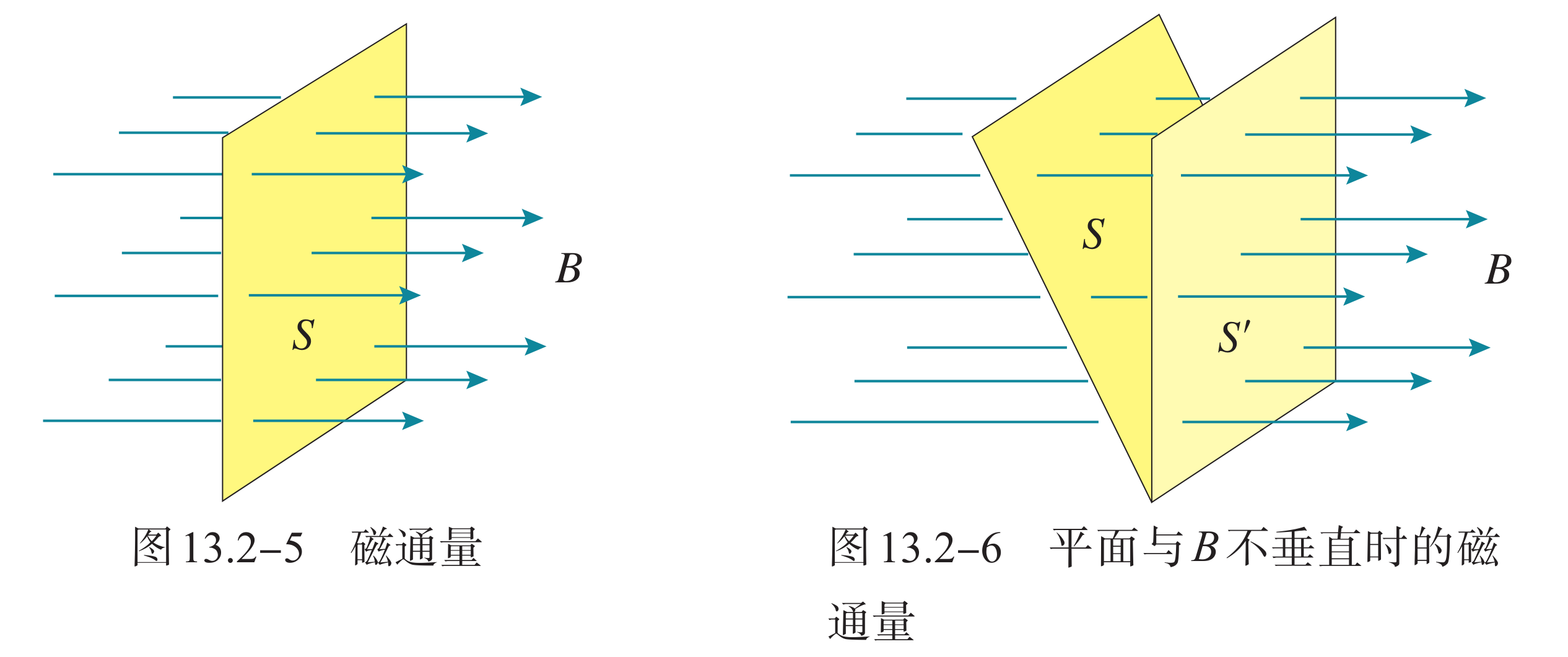 为了研究问题的方便,人们还引入一个叫做磁通量的物理量。设在磁感应强度为 \(B\) 的匀强磁场中或在一个非匀强磁场中可以视为匀强的小区域中,有一个与磁场方向垂直的平面,面积为 \(S\),则 \(B\) 和 \(S\) 的乘积就叫做穿过这个面积的磁通量,简称磁通。用字母 \(\Phi\) 表示,即: