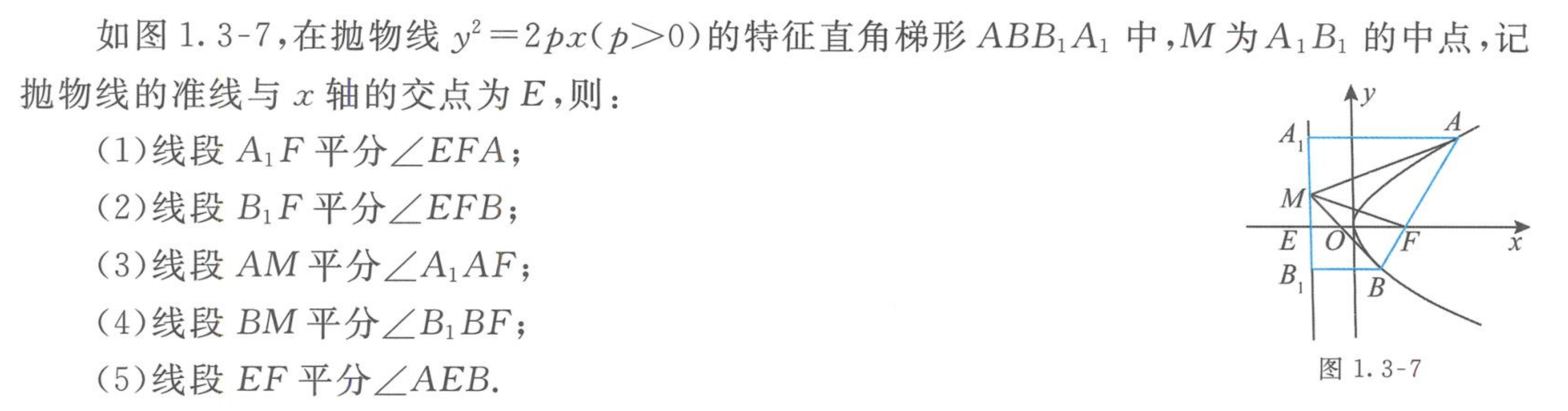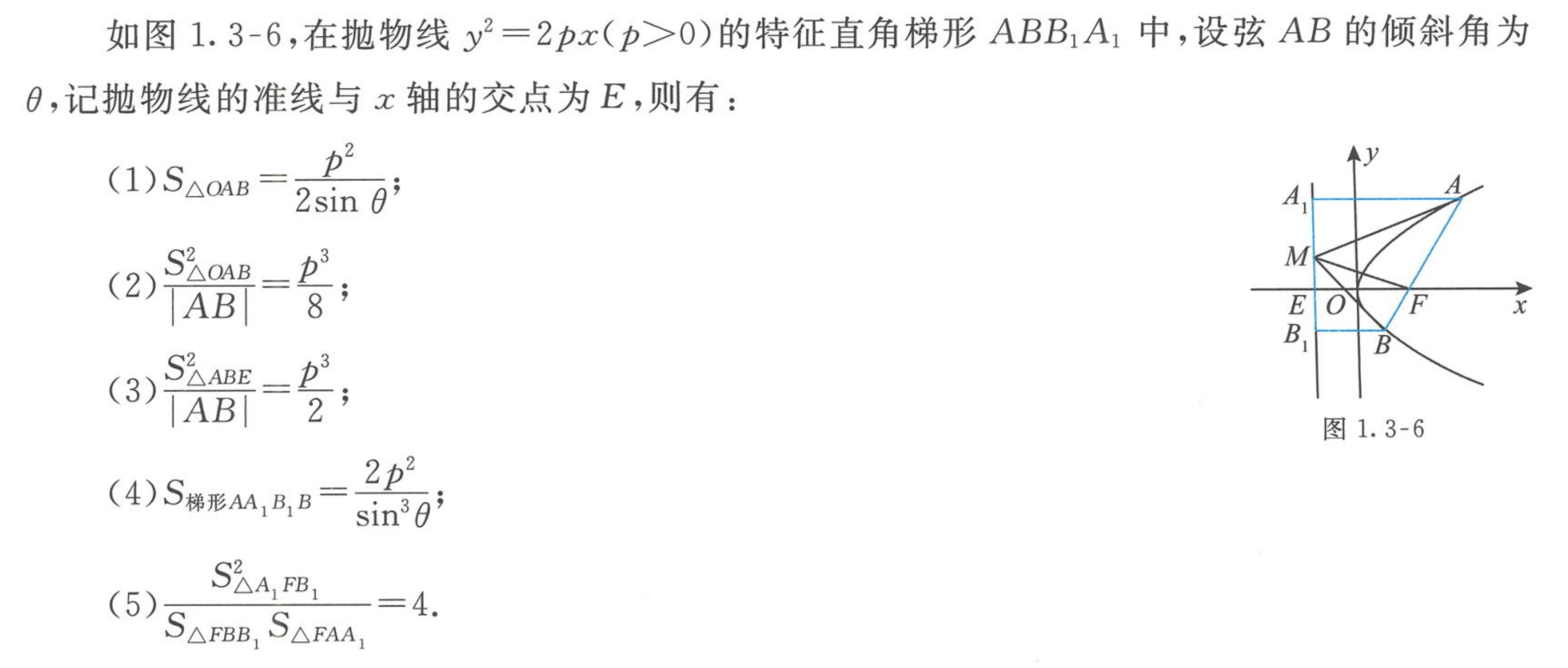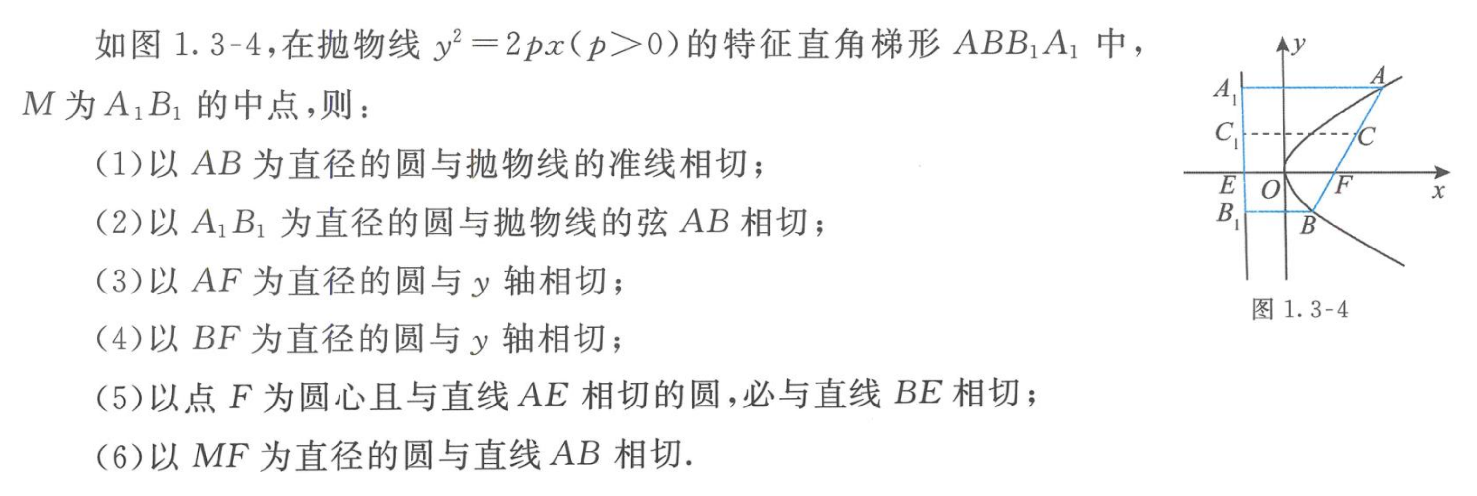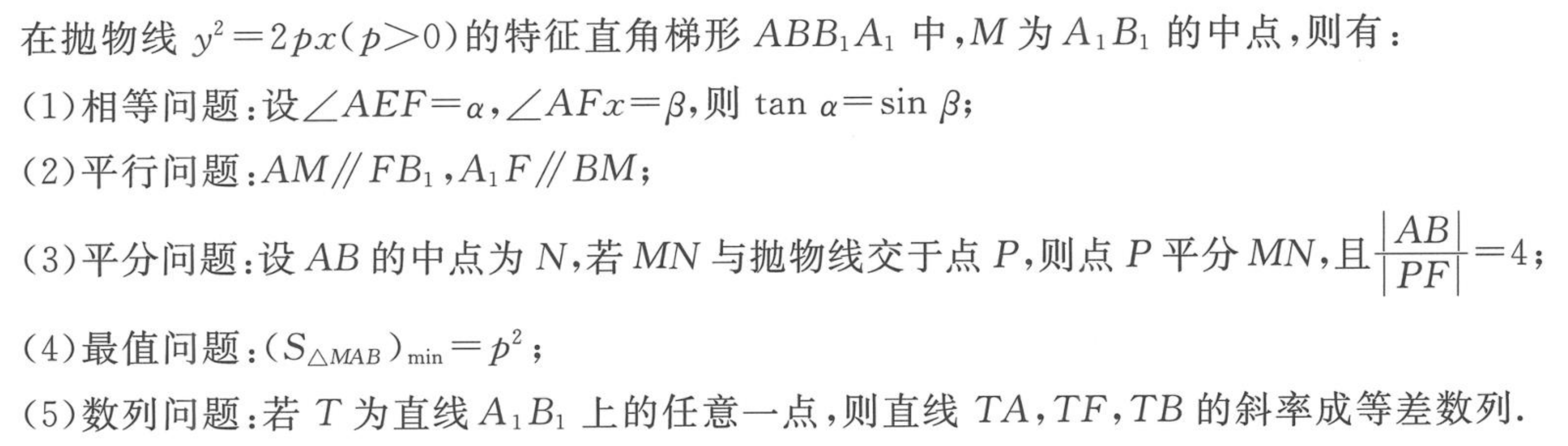 过焦点的直线交抛物线与点 \(A,B\) 过 \(A,B\) 做准线 \(\ell\) 的垂线 \(AC,BC\),锁围成的直角梯形称为抛物线的特征直角梯形。