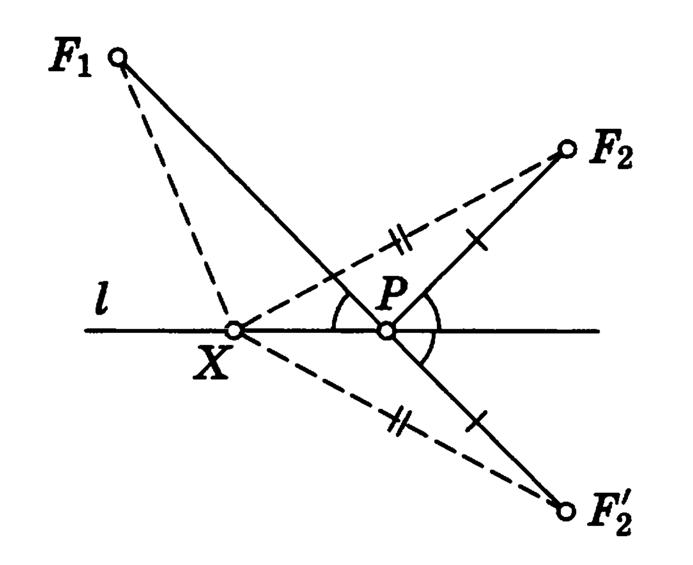 设光线从 \(F_1\) 经过直线 \(\ell\) 的反射到达 \(F_2\) 点,我们将 \(F_1\) 关于 \(\ell\) 对称的点设为 \(F_1'\)