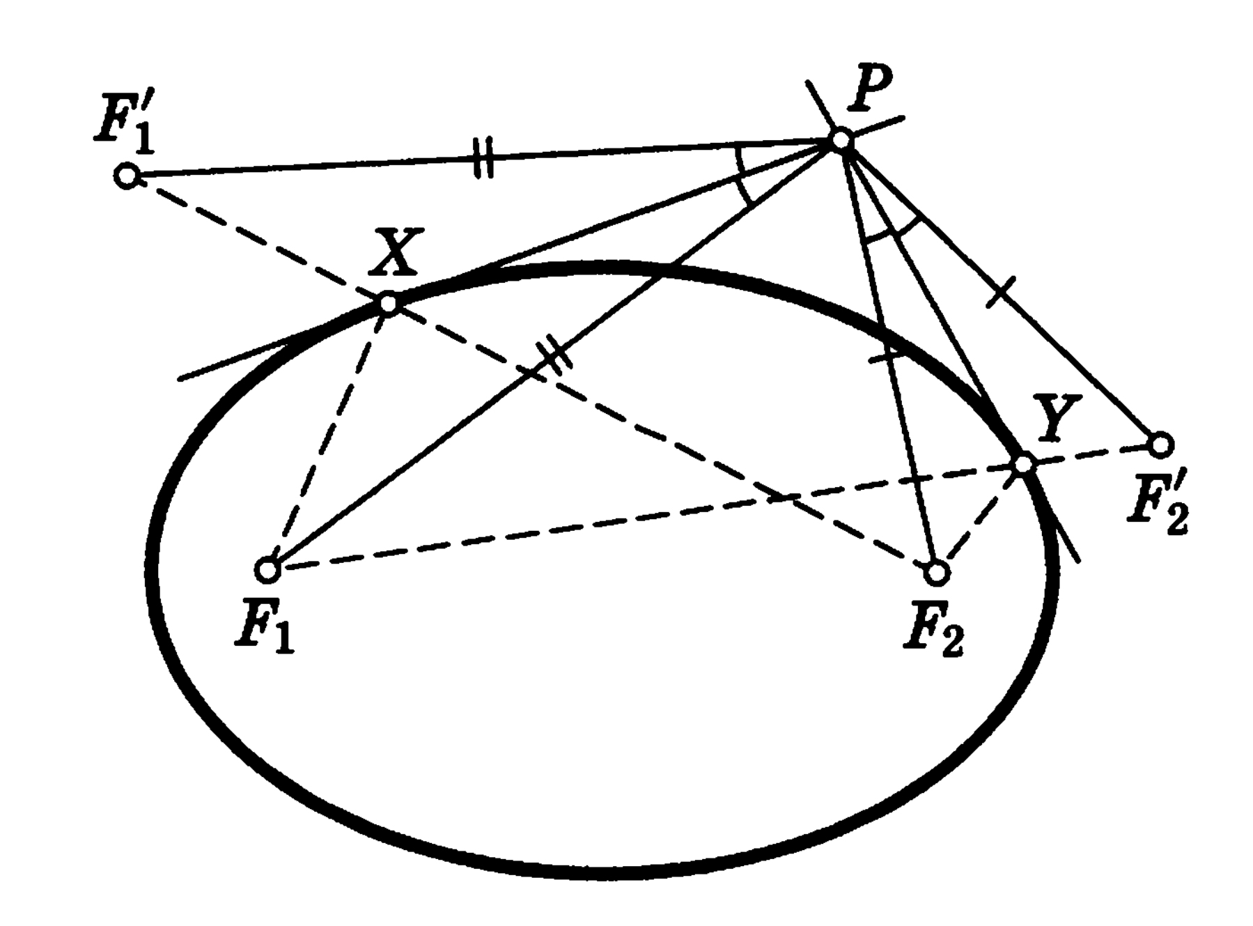 椭圆的等角共轭:过椭圆外一点 \(P\) 做切线 \(PX,PY\),切点为 \(X,Y\)。连接 \(PF_1,PF_2\),则 \(\angle XPF_1=\angle YPF_2\)。