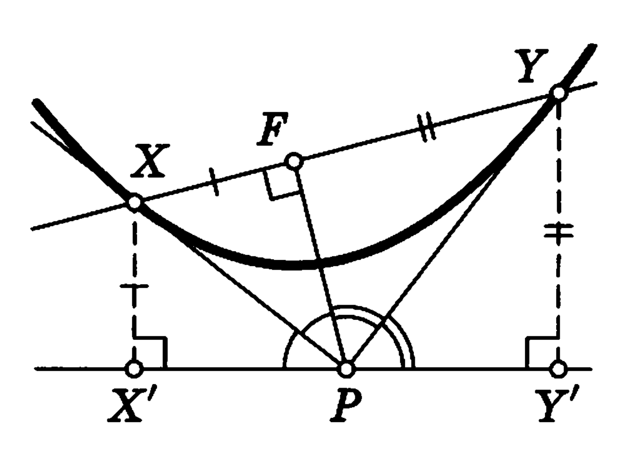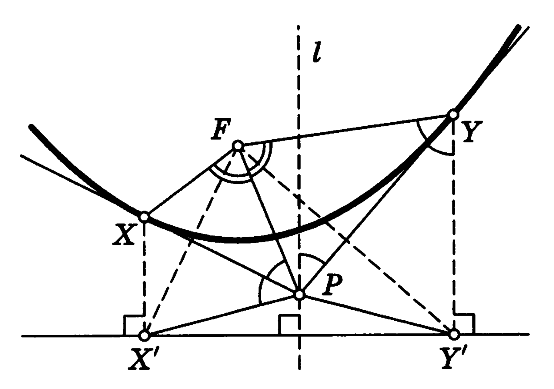 假设抛物线在点 \(X\) 和 \(Y\) 的切线相交于点 \(P\)。那么 \(PX'=PY'=PF\),其中 \(X'\) 和 \(Y'\) 是 \(X\) 和 \(Y\) 在抛物线准线上的投影,而 \(F\) 是抛物线的焦点。