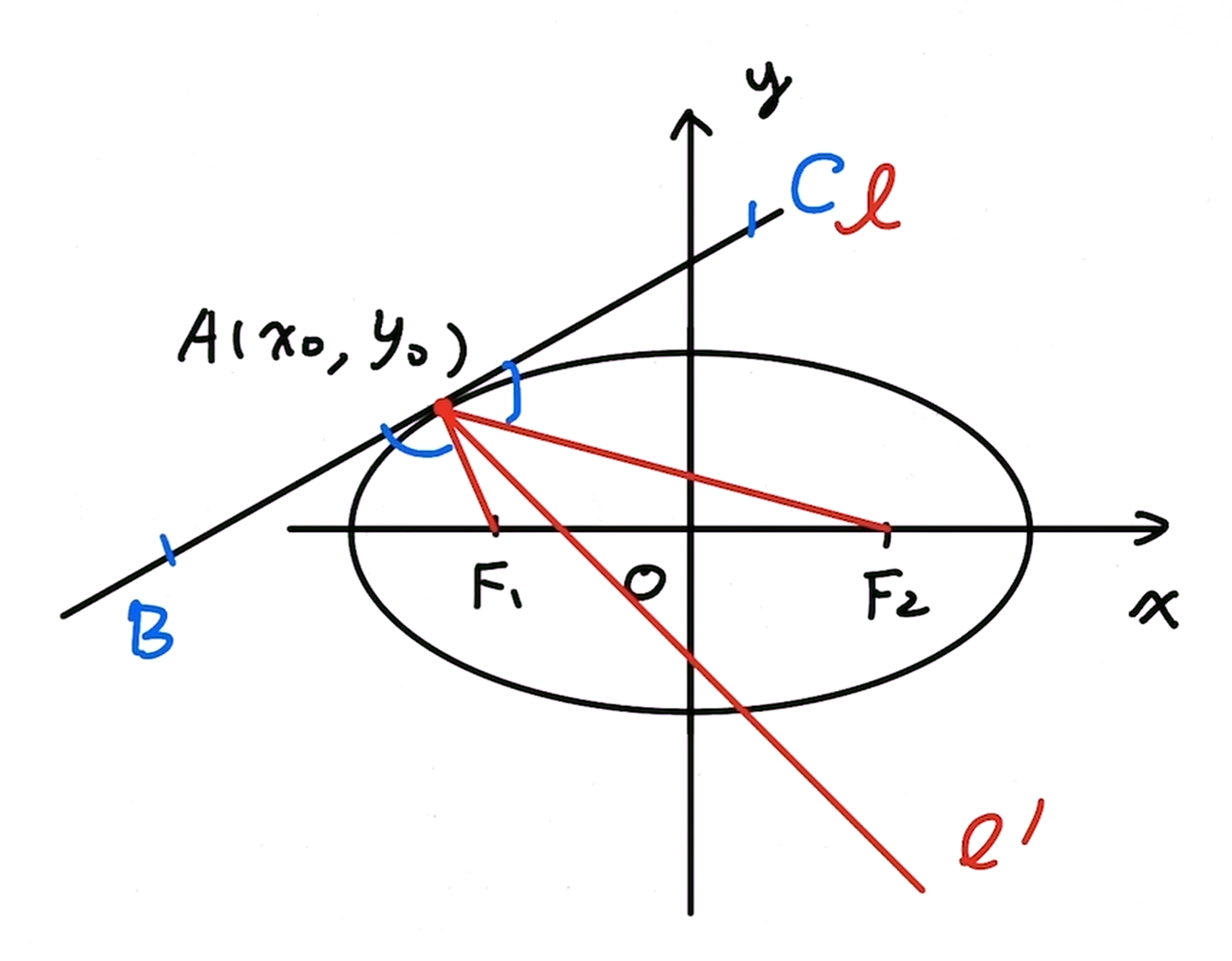 则 \(P\) 点位于 \(F_1'F_2\) 与 \(\ell\) 的交点上,这就是将军饮马模型,也容易证明,入射角和出射角是相等的。