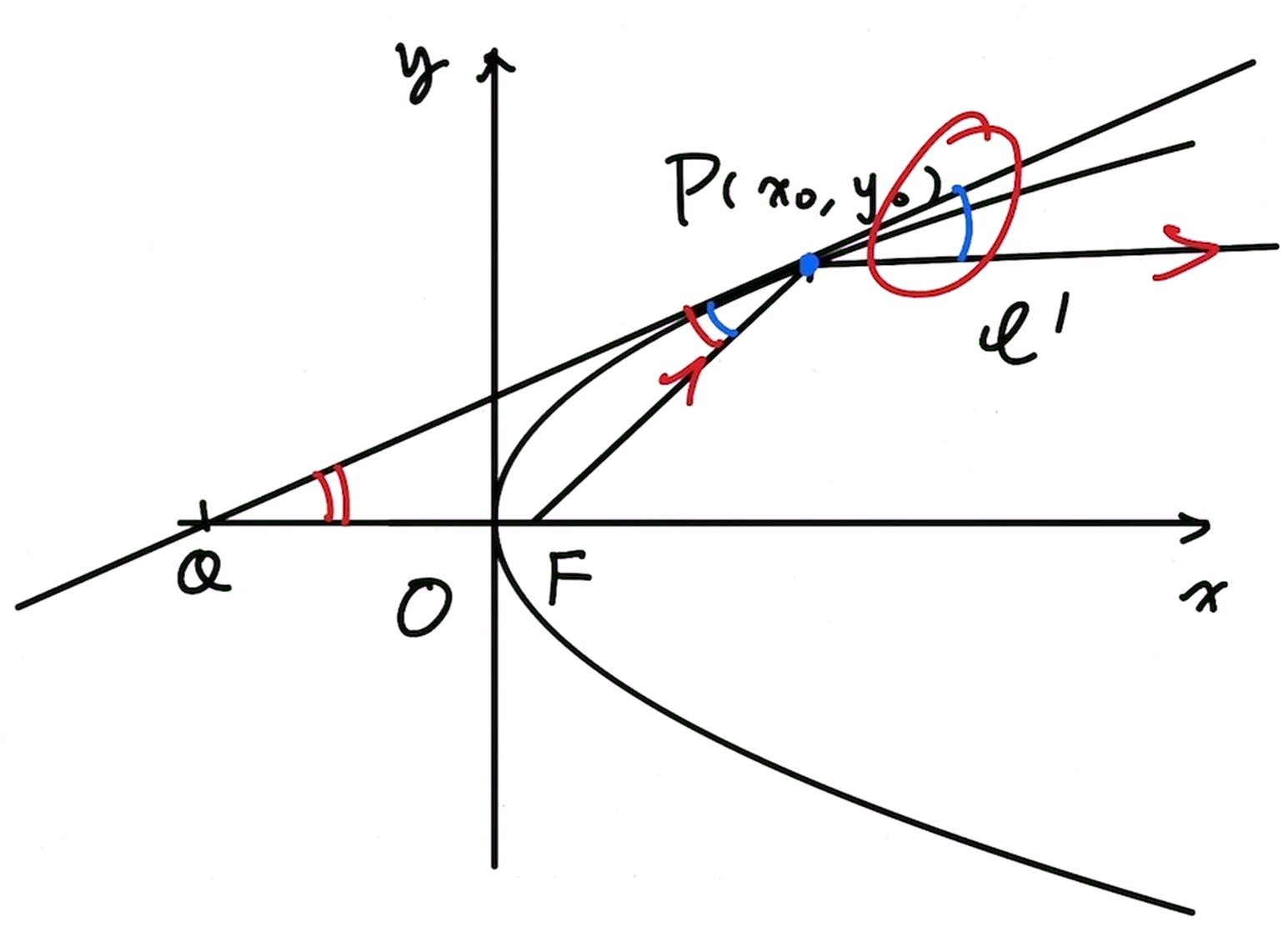 不妨假设角平分线 \(\ell'\) 与抛物线相交与 \(P,Q\) 两点,做 \(QQ'\) 垂直于准线。根据抛物线的定义,有 \(FP=PP'\),因此也有 \(QF=QP'\),又因为 \(FQ=QQ'\),因此 \(P=Q\),即 \(\ell=\ell'\),证毕。