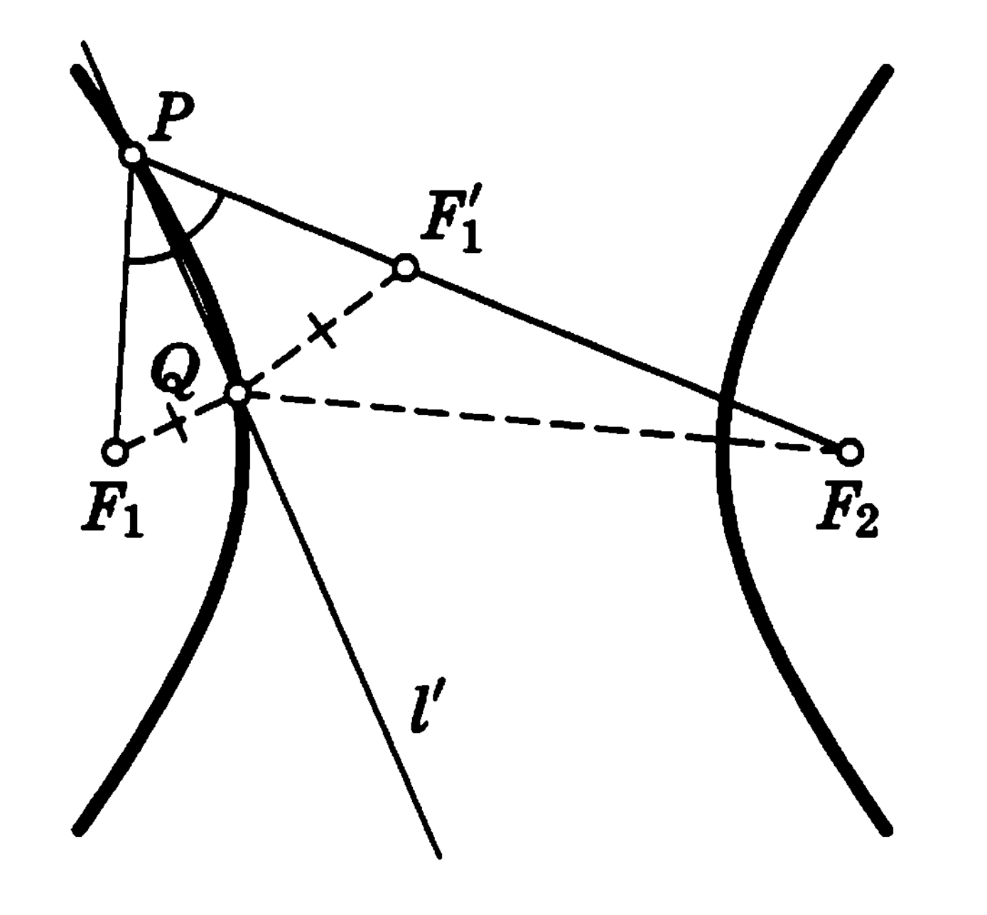 根据已经证明的全等,因此 \(\angle PF_1X = \angle PF_1'F_2 = \angle PF_1F_2' = \angle PF_1Y\),也就是说对于曲线外一点 \(P\) 与焦点的连线一定平分两个切点与这个焦点所构成的角。