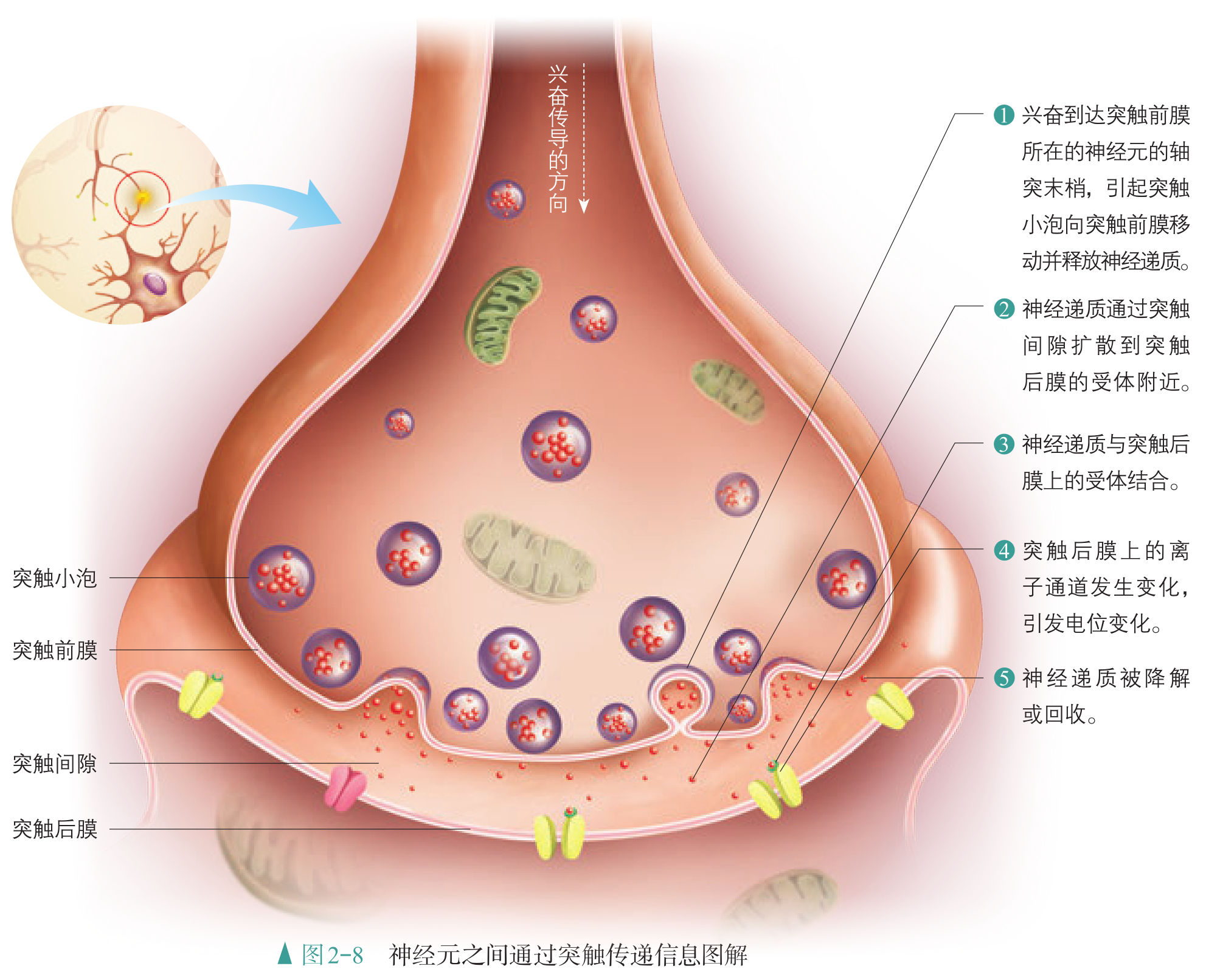 突触的结构包括突触前膜、突触间隙与突触后膜。在神经元的轴突末梢处,有许多突触小泡。当轴突末梢有神经冲动传来时,突触小泡受到刺激,就会向突触前膜移动(与钙离子等有关)并与它融合,同时释放一种化学物质—神经递质。神经递质经扩散通过突触间隙,与突触后膜上的相关受体结合,形成递质-受体复合物,从而改变了突触后膜对离子的通透性,引发突触后膜电位变化,这样,信号就从一个神经元通过突触传递到了另一个神经元。随后,神经递质会与受体分开,并迅速被降解(例如乙酰胆碱酶)或回收进细胞(被突触前膜回收),以免持续发挥作用。