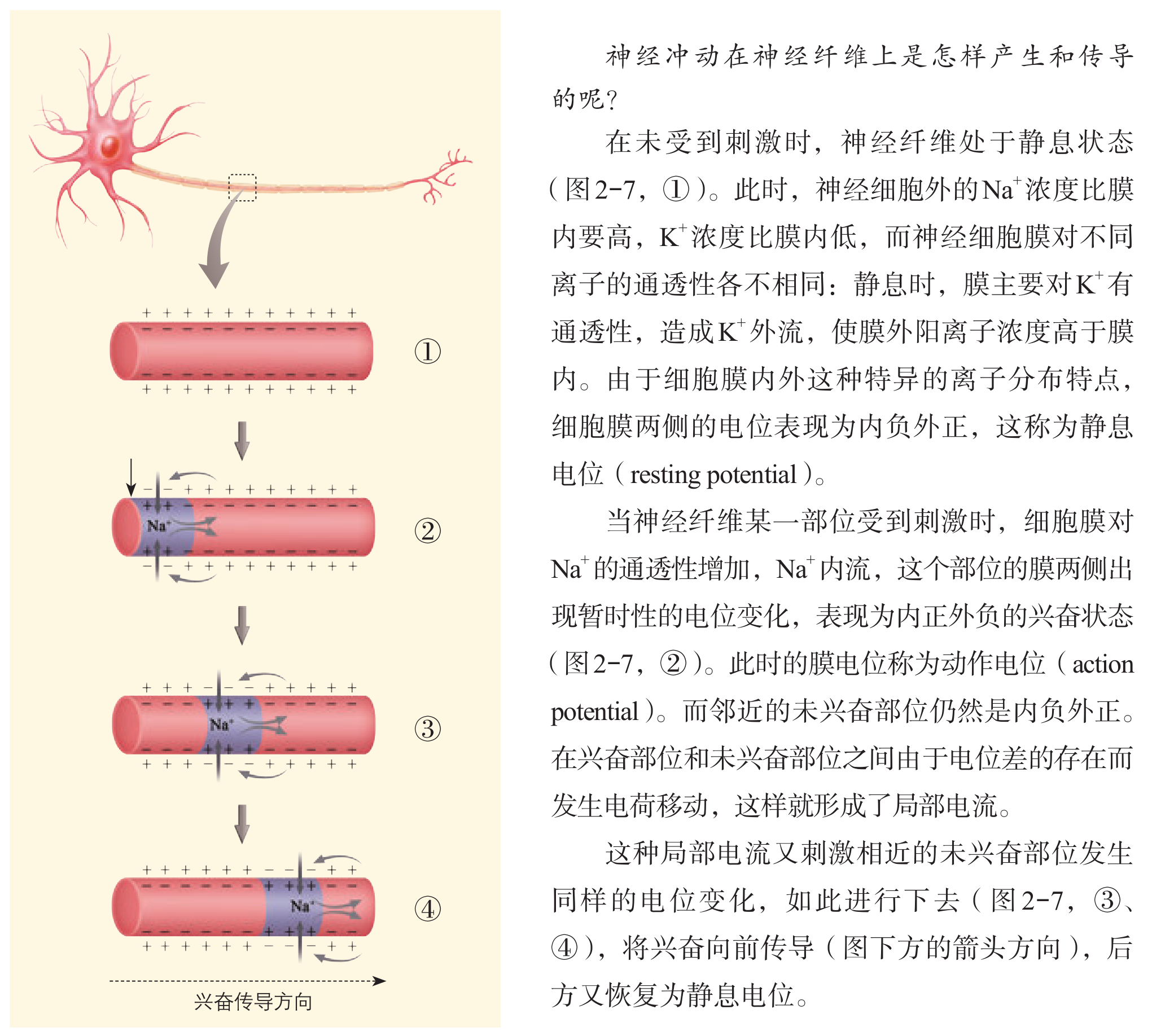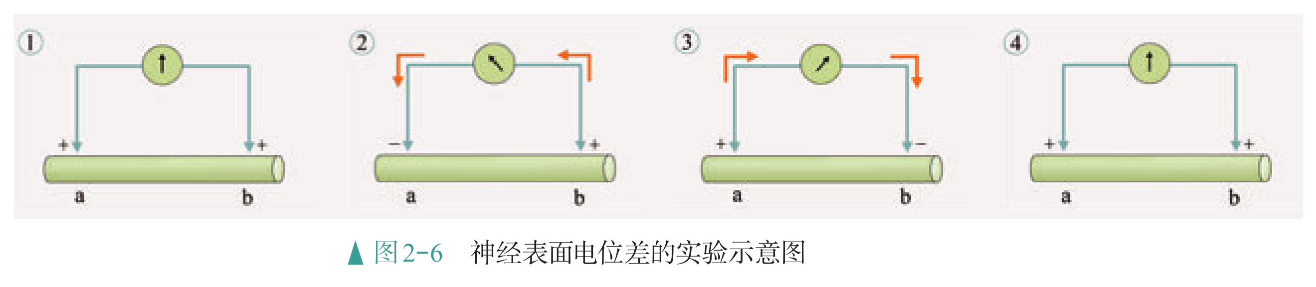 在蛙的坐骨神经上放置两个微电极,并将它们连接到一个电表上。静息时,电表没有测出电位变化(1),说明神经表面各处电位相等。当在图示神经的左侧一端给予刺激时,靠近刺激端的电极处(a 处)先变为负电位,接着恢复正电位(2、3);然后,另一电极处(b 处)变为负电位,接着又恢复为正电位(3 、4)。