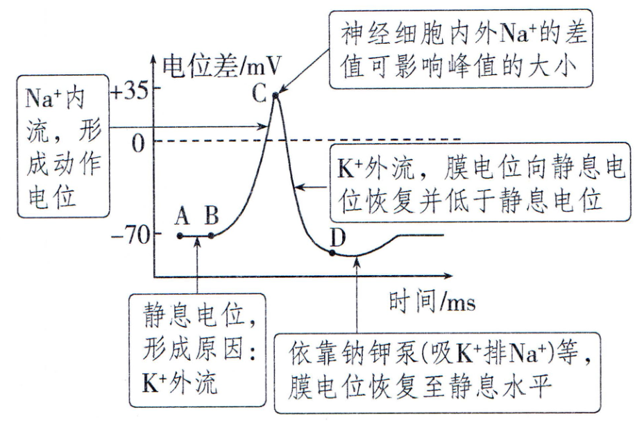 - 钠离子浓度只影响动作电位的峰值;