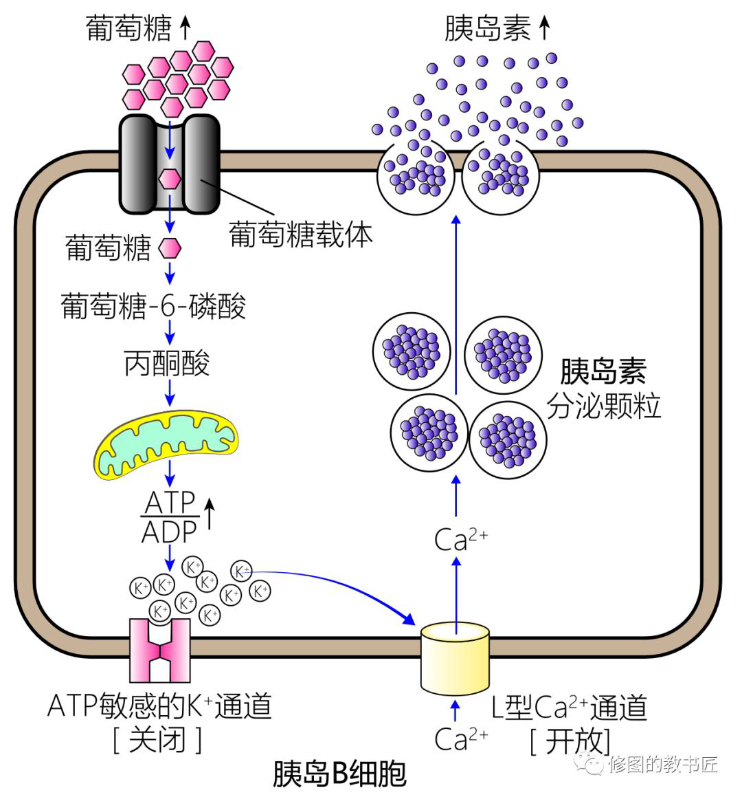 血糖浓度升高,葡萄糖通过胰岛 B 细胞膜上的葡萄糖载体进入胰岛 B 细胞。葡萄糖经氧化反应使细胞内的 ATP/ADP 比率,导致细胞膜中的 ATP 敏感型钾离子通道关闭,使细胞膜内的电位升高,激活电压门控的钙离子通道,钙离子通道开放,导致钙离子内流增加,触发胰岛素分子释放到细胞外。