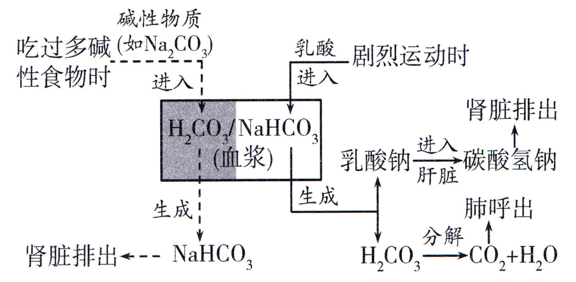 正常人的血浆近中性,pH为 \(7.35 \sim 7.45\)。血浆的pH之所以能够保持稳定,与其中含有的 \(\ce{HCO3-,H2CO3}\) 等物质有关。