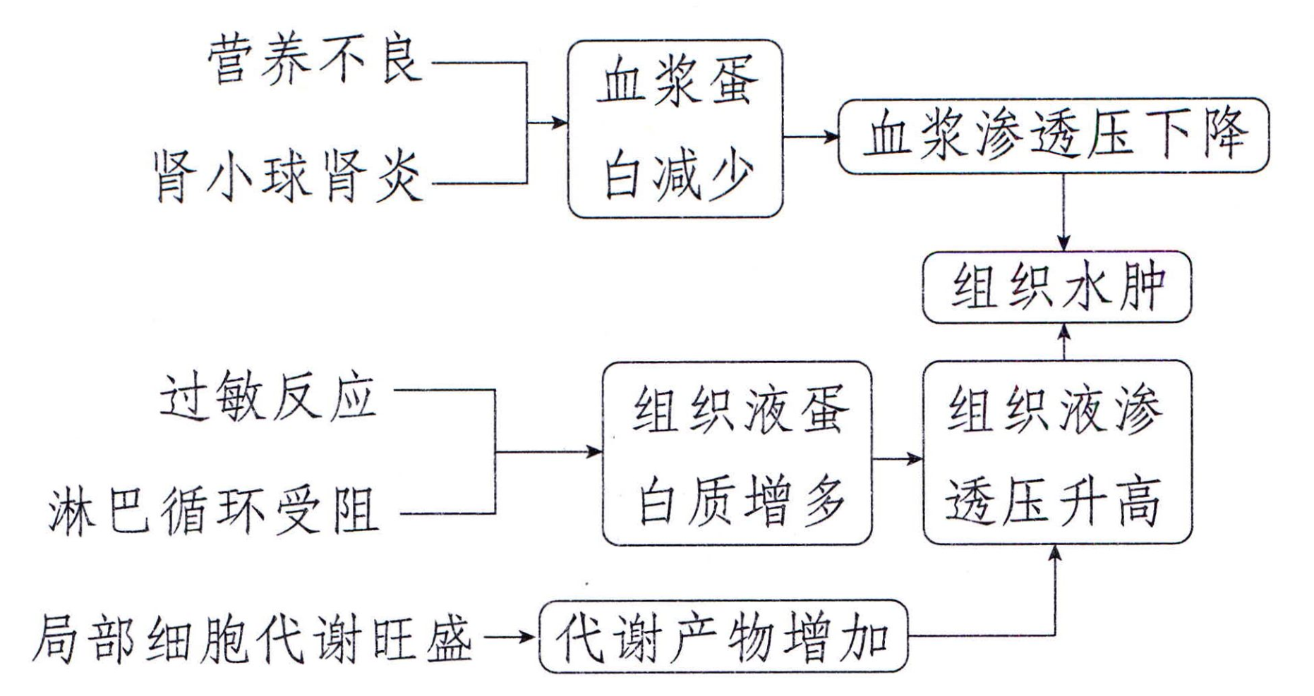 组织细胞受损,血浆中的物质进入组织液,导致组织液渗透压升高,或者长期饥饿血浆中无机盐和蛋白质减少,血浆渗透压降低,进而导致组织水肿。
