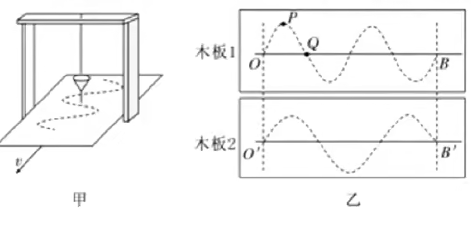 漏斗漏沙子模型:一条细绳拴着一个装满沙子的漏斗,做单摆运动,沙子缓慢均匀漏下,下方垫一块匀速运动的毯子,则沙子在毯子上留下的轨迹近似为一个正弦图像。