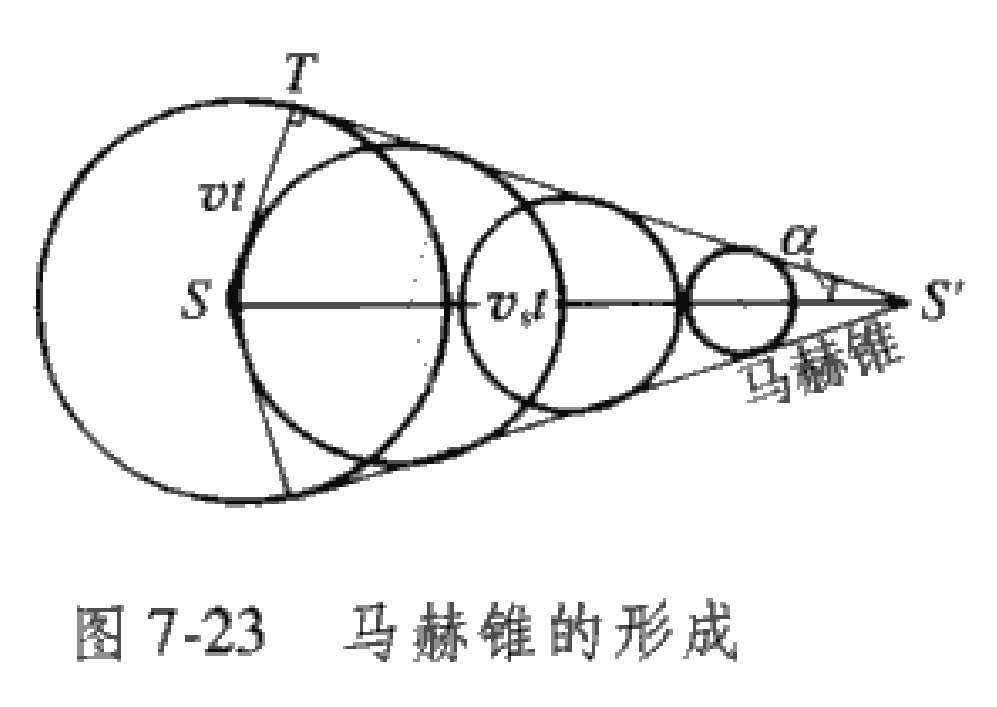 如图,波源在经过 \(S\) 点时发出的波,在其后 \(t\) 时刻的波阵面为半径为 \(vt\) 都球面,波源次此时已经前进了 \(v_{\text{s}}t\) 的距离到达 \(S'\) 点,在整个 \(t\) 时间内,波源发出的波所到达的前沿形成了一个圆锥面。这个锥形称为马赫锥,马赫锥是波的前缘,其外没有波动产生,这种形式的波动叫做艏波。这个锥形的顶角 \(\alpha\) 有公式