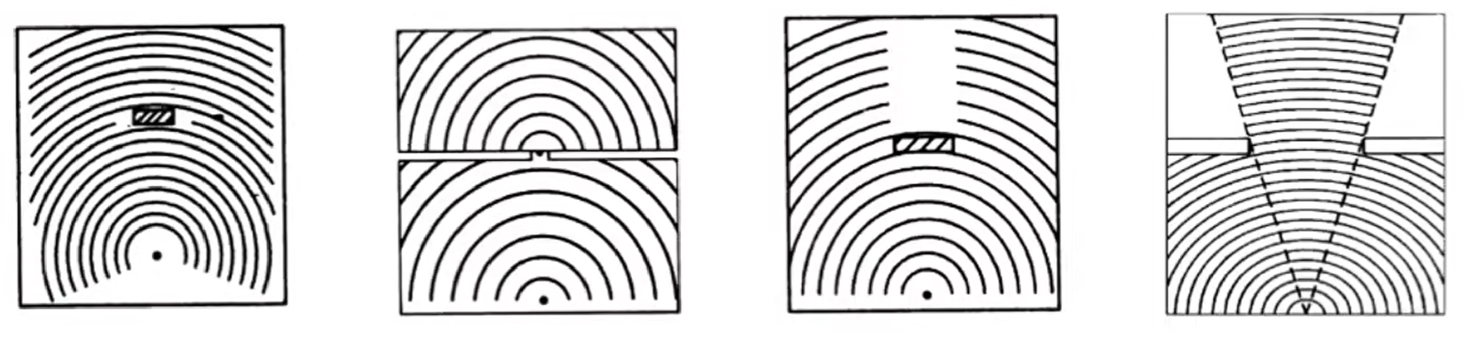 光波对于狭缝或孔径的衍射也可以用这方式处理,但直观上并不明显,因为可见光的波长很短,因此很难观测到这种效应。