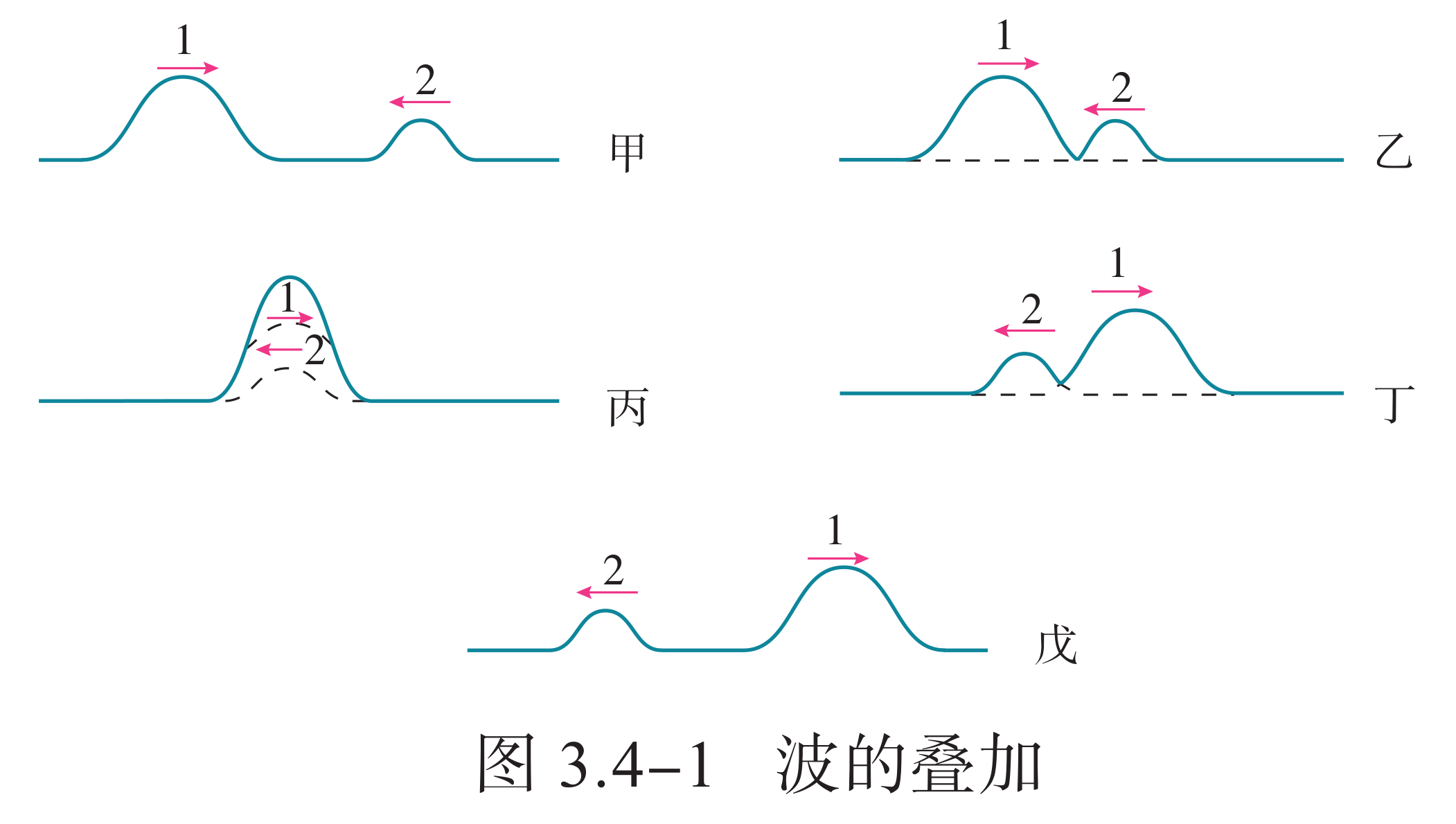 两列波在彼此相遇并穿过后,波的形状和相遇前一样,传播的情形也和相遇前一样。