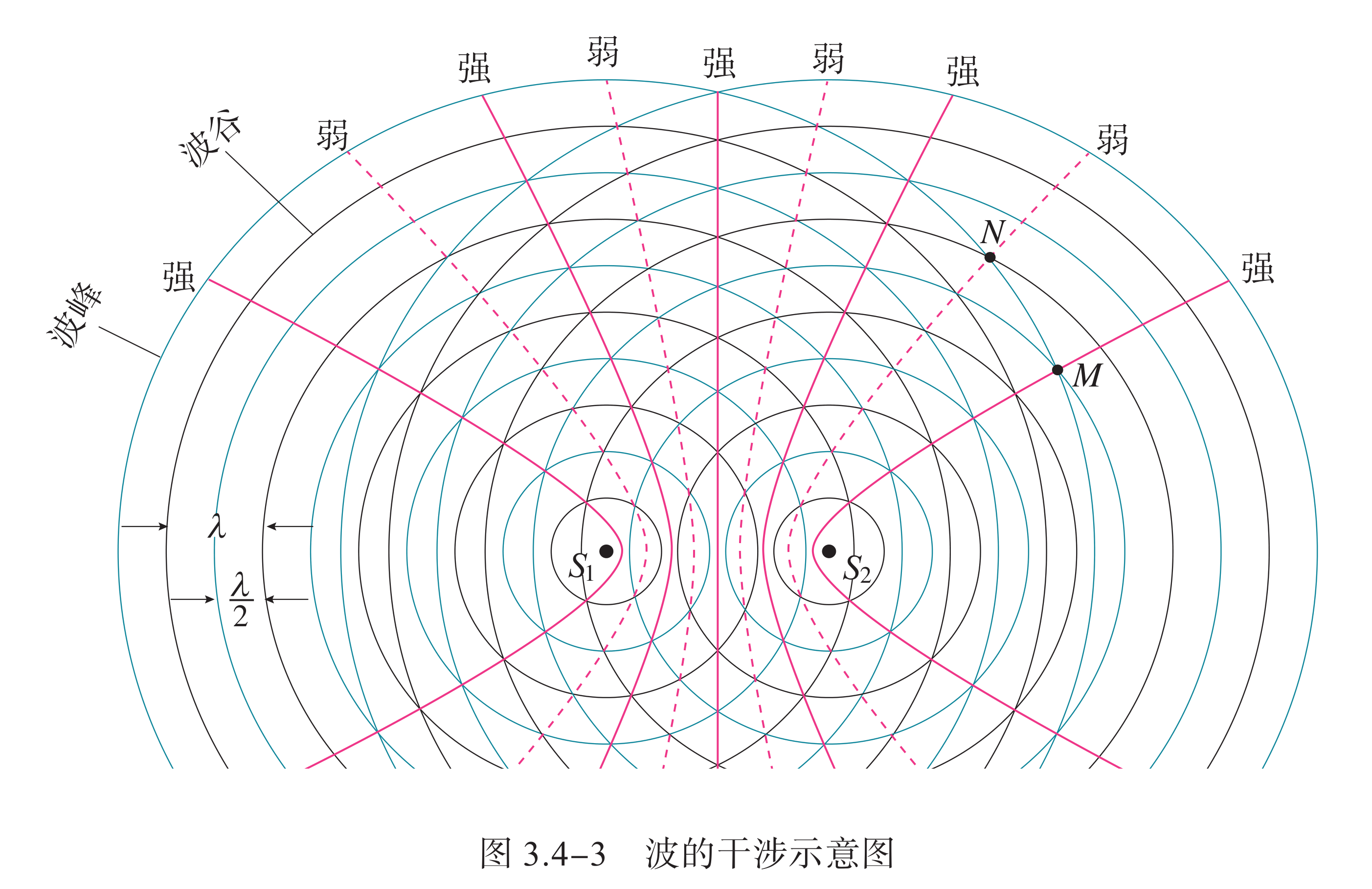\[ ||PS_1|-|PS_2||=\paren{k+\dfrac{1}{2}}\lambda \]则 \(P\) 点为振动减弱点。
