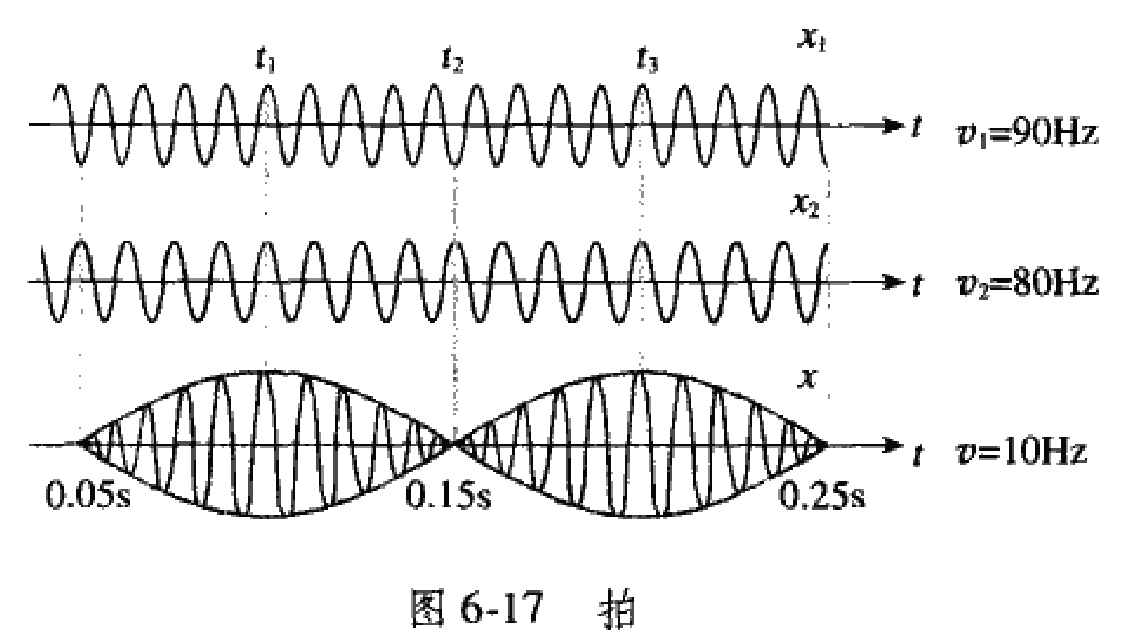 我们把同一直线上频率相近的两个简谐振动合成时,所产生的合振幅时而加强时而减弱的周期性现象,叫做拍。单位时间内合振幅加强或减弱的次数叫做拍频。