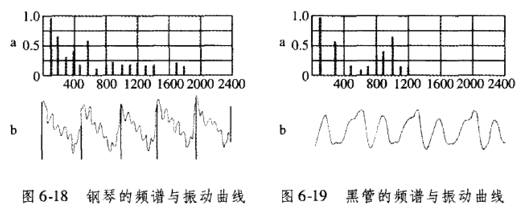 实验表明,任何复杂的周期性运动,都可以看作频率成整数倍的简谐振动的合振动。频率最低的叫做基音,其余的叫做泛音。音高是由基音决定的,而音色是由泛音的多少、频率和振幅决定的。