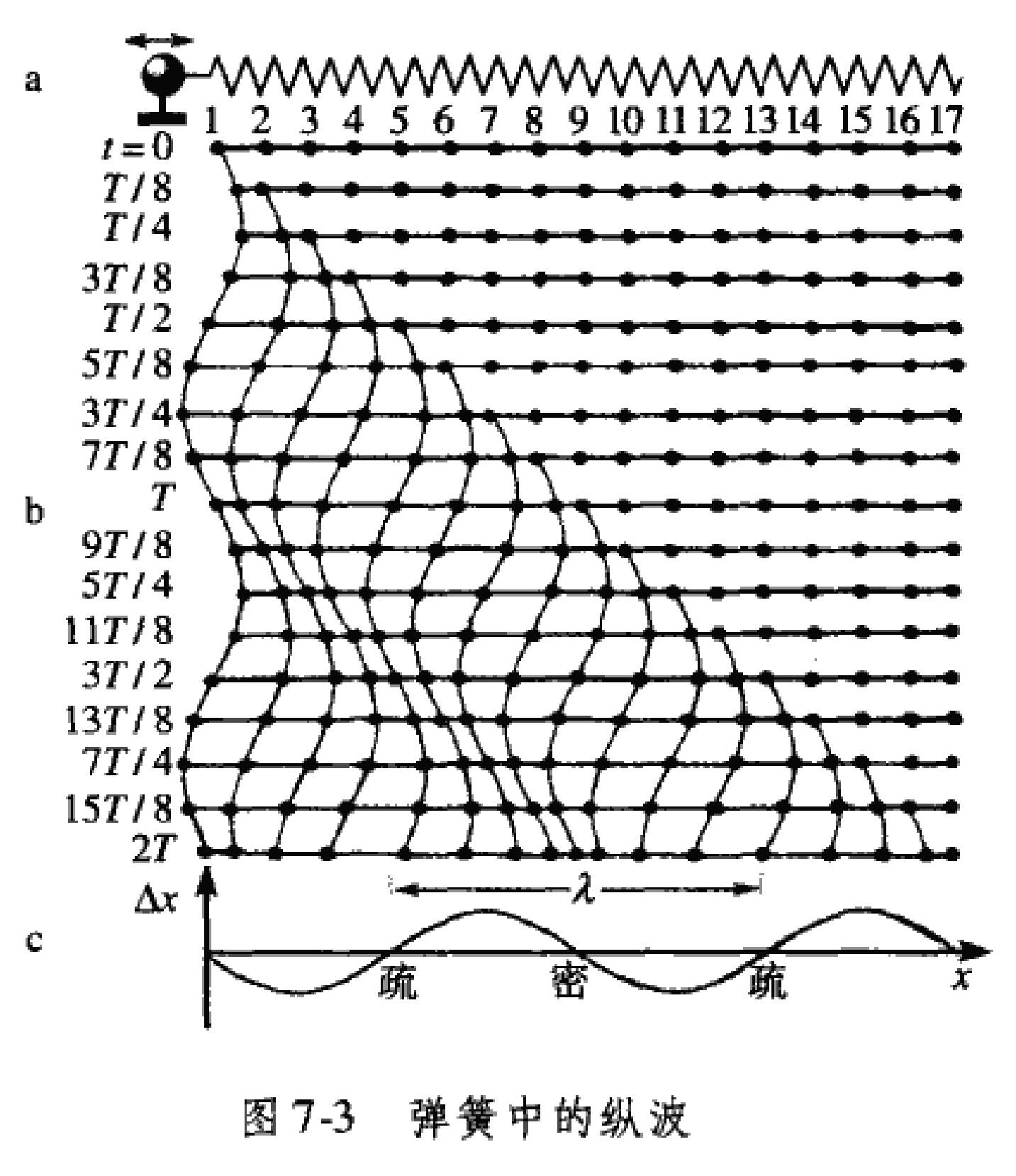 纵波(例如声波):质点左右振动,波向右传播,二者的方向在同一直线上。质点的振动方向与波的传播方向在同一直线上的波,叫作纵波。在纵波中,质点分布最密的位置叫作密部,质点分布最疏的位置叫作疏部。