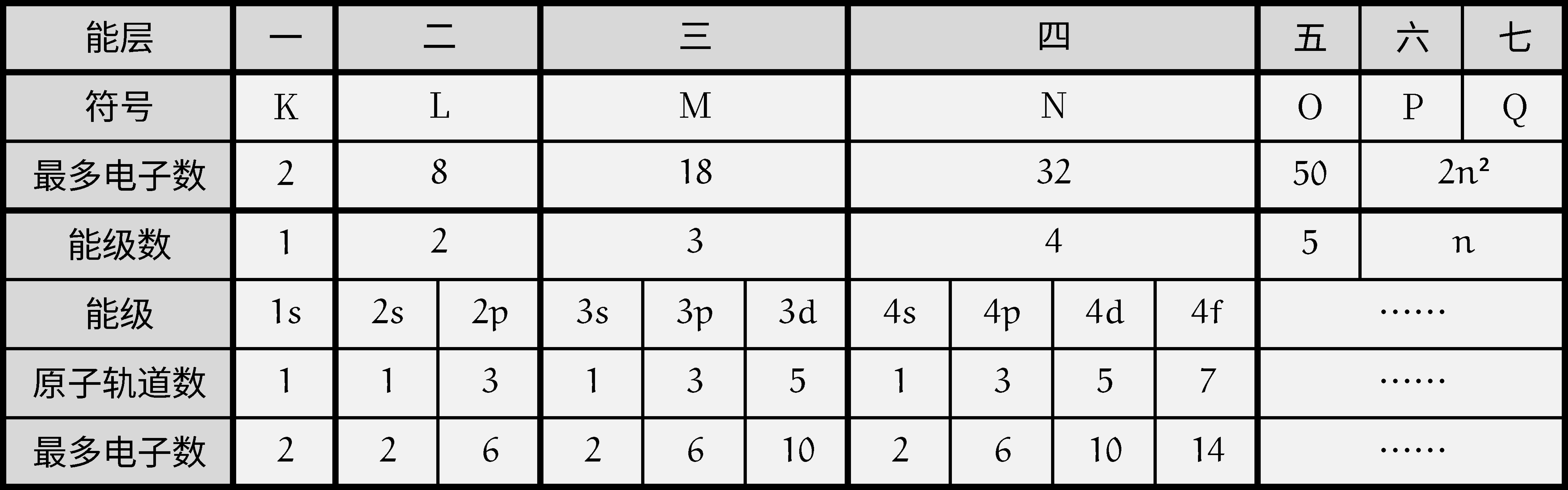 主量子数 \(n\) | 描述电子离核远近 | 电子离核越远 主量子数越大 能量越大 | 字母与数字对应 \(1,2,3,4,5,6,7\) \(\mathrm{K,L,M,N,O,P,Q}\) |